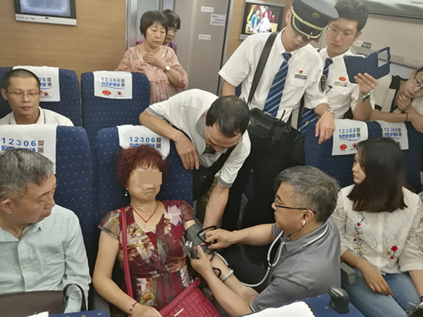 “初步考虑可能是‘心绞痛、心源性休克’,要赶紧联系医院。”左国庆一边安抚患者,一边让乘务员赶紧拨打120。同时,他在乘务员送来的列车抢救包中取出速效救心丸,让患者立即服下,并嘱咐患者安静平卧在座位上,帮助她舒缓四肢。经过紧急诊治,10分钟后,患者病情得到有效控制,胸痛缓解、口唇变红,四肢变暖,脉搏有力。