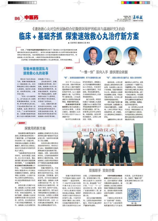 近期,广东省中医院张敏州教授领衔启动了《速效救心丸对急性冠脉综合征微循环保护的临床与基础研究》,该项目由张敏州教授团队与天津中新药业集团股份有限公司联合发起,旨在观察速效救心丸对急性冠脉综合征微循环的保护作用,对速效救心丸治疗冠心病、心梗的作用机制做更深层次的探索。