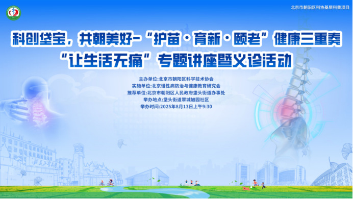 8月13日,由北京市朝阳区科协主办、垡头街道办事处推荐、北京慢性病防治与健康教育研究会承办、垡头街道翠城旭园社区大力支持的朝阳区基层科普项目“科创垡宝,共朝美好-‘护苗·育新·颐老”’健康三重奏”之“让生活无痛”专题讲座暨义诊活动在垡头街道翠城旭园社区内圆满举行。此次活动旨在为居民带来科学实用的疼痛管理知识,助力社区居民远离疼痛折磨,拥抱健康生活。
