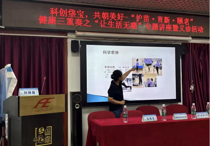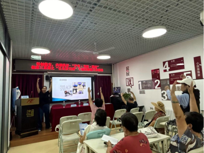 在居家缓解疼痛小妙招工坊环节,刘晓磊医生带领居民们学习简单有效的拉伸操。她一边示范动作,一边耐心讲解每个动作的要领和功效。居民们认真学习,跟着刘医生的节奏进行练习。这些拉伸操简单易学,无需特殊场地和器材,居民们表示回家后将坚持练习,以缓解日常疼痛,提高生活质量。