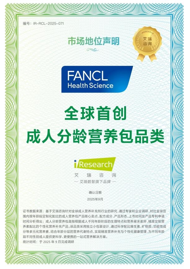 近日,艾瑞咨询正式发布国际知名健康食品品牌FANCL Health Science“亚洲营养保健品领导品牌”、“全球首创成人分龄营养包品类”、“口服类体重管理领导品牌”及“控糖控脂双重阻断营养保健品开创者”四项市场地位声明证书。这一系列认证基于艾瑞咨询对全球及亚洲营养保健品行业的深度研究、严谨的企业调研与多维度数据对比分析,充分肯定了FANCL Health Science在产品创新、技术研发及市场领导力方面的卓越成就。