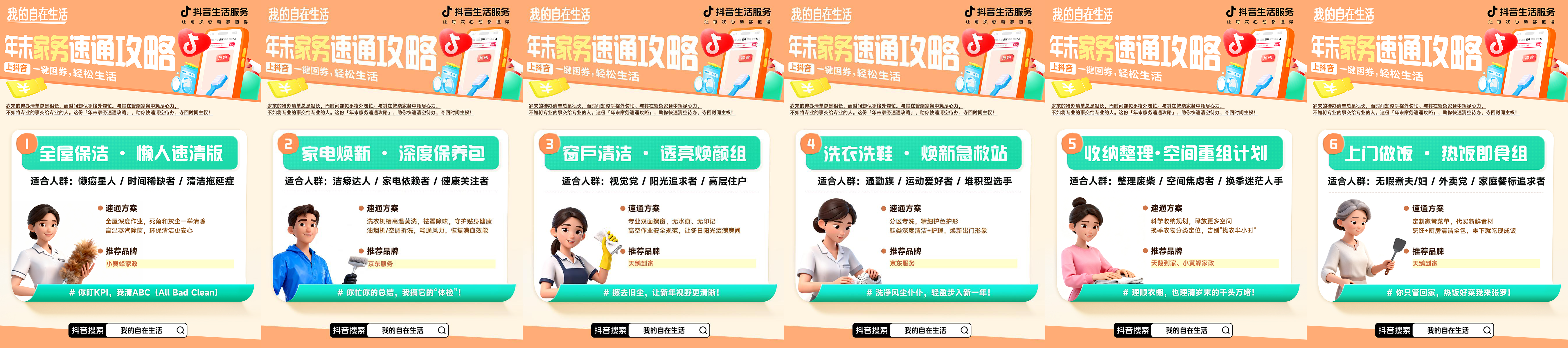 年终扫除的时节如期而至,但这一次,我们无需再独自苦战!抖音生活服务「我的自在生活」第二弹——“年末家务速通攻略”正式上线。是时候告别与灰尘油污的漫长缠斗,让专业服务为你一键清空所有待办事项,赢回本该属于自己和家人的宝贵时光。用最高效的“速通”智慧,迎接一个真正轻盈、敞亮的新年。
