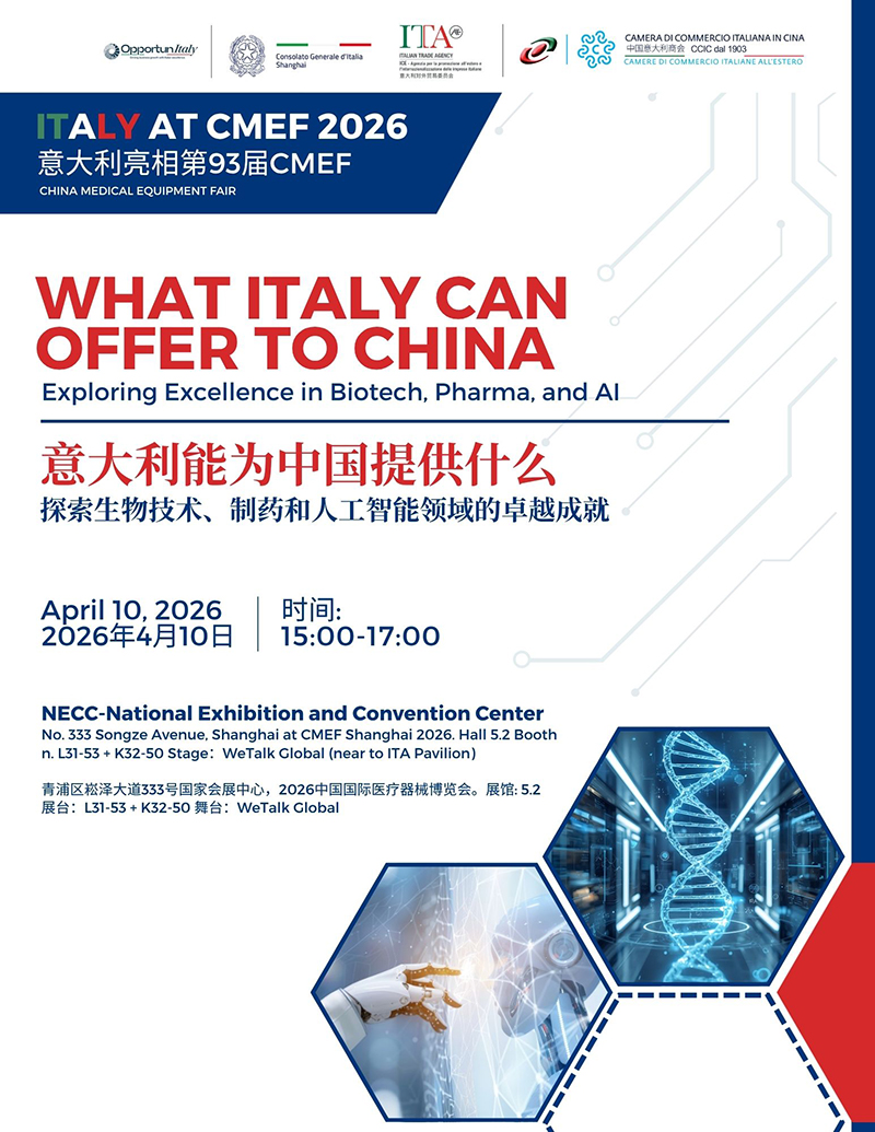 展会同期,意大利驻上海总领事馆将携手意大利对外贸易委员会(ITA),中国意大利商会(CCIC)及其医疗保健工作组(HCWG)共同举办一场高层研讨会,主题为“意大利能为中国提供的机遇——探索生物科技、制药与人工智能领域的卓越优势”。