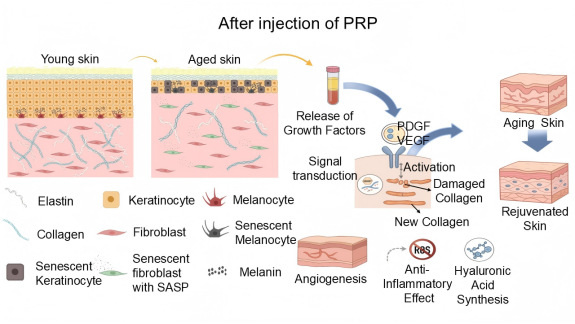 皮肤衰老分为自然老化与光老化,随着年龄增长表现为胶原流失、弹性下降、皱纹、干燥、暗沉等问题。PRP等血小板衍生物通过以下机制改善皮肤状态: