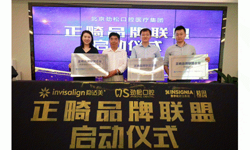 从左至右分别为:劲松口腔运营总经理王美娜女士、北京市朝阳区非公有制医疗机构协会赵锡银秘书长、隐适美北大区商务总监张晗超先生、Insignia市场总监Leo张先生2019年6月29